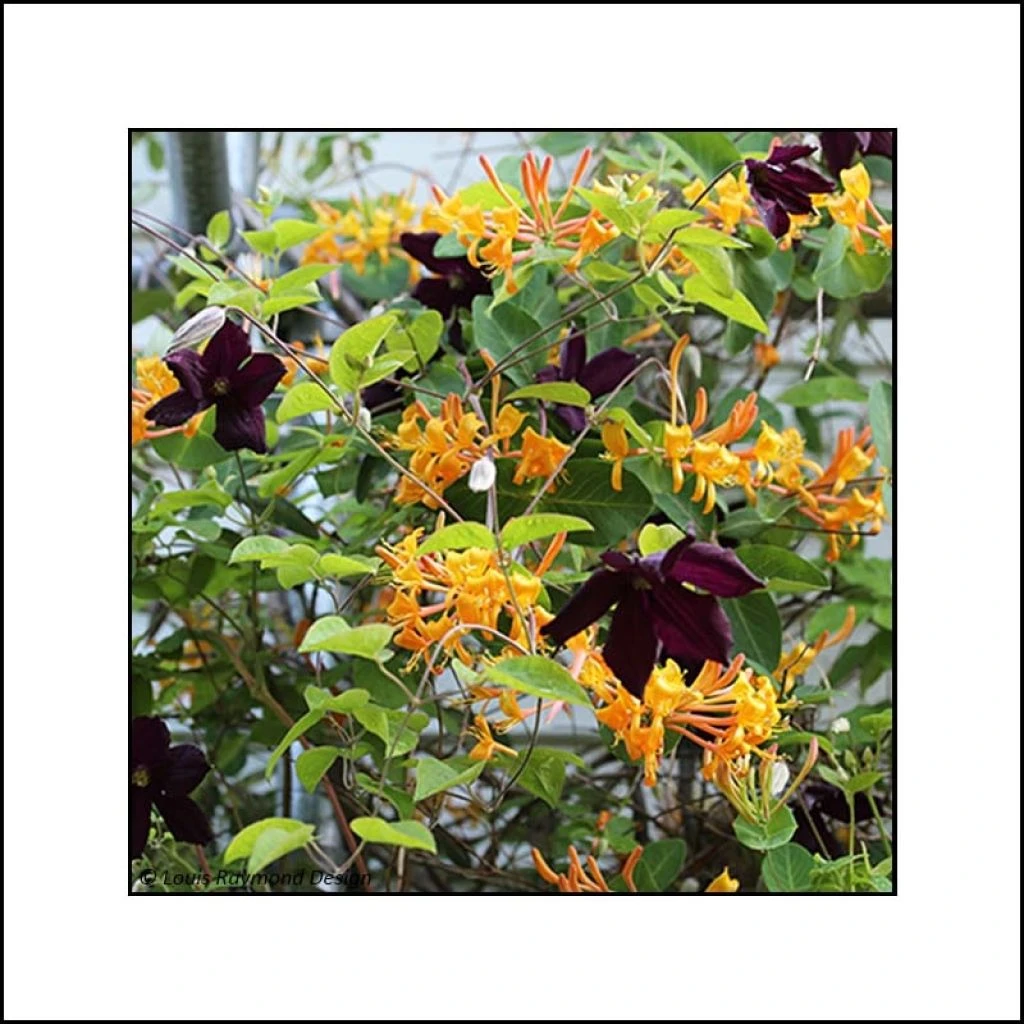 Ce duo est composé d’un plant de Clematis Romantika et d’un plant de Lonicera Mandarin.